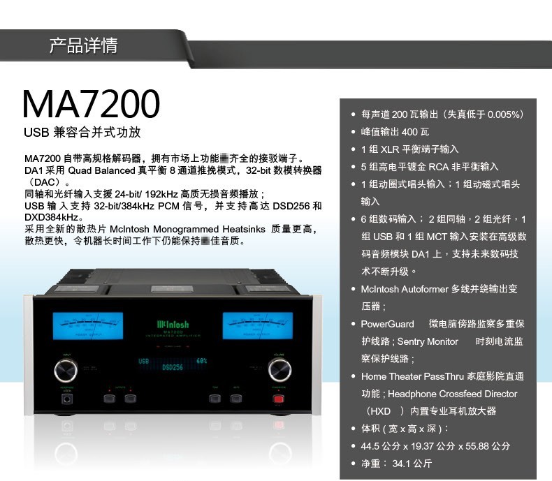 麦景图(mcintosh) MA7200 USB兼容合并式功放 美国功率放大器 黑色
